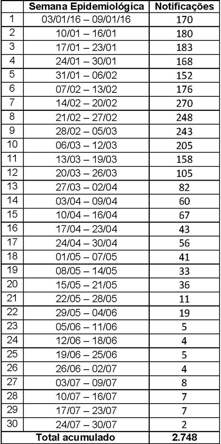 Tabela com o número de casos de zika por semana epidemiológica 2016